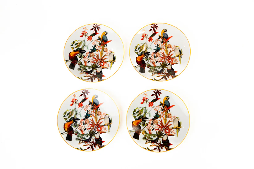 A coleção Brasil lustrado mergulha na riqueza da fauna e flora brasileira – araras, bromélias, folhagens e cores que dançam em porcelana como uma aquarela viva.