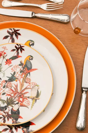 - Brasil lustrado mergulha na riqueza da fauna e flora brasileira – araras, bromélias, folhagens e cores que dançam em porcelana como uma aquarela viva.