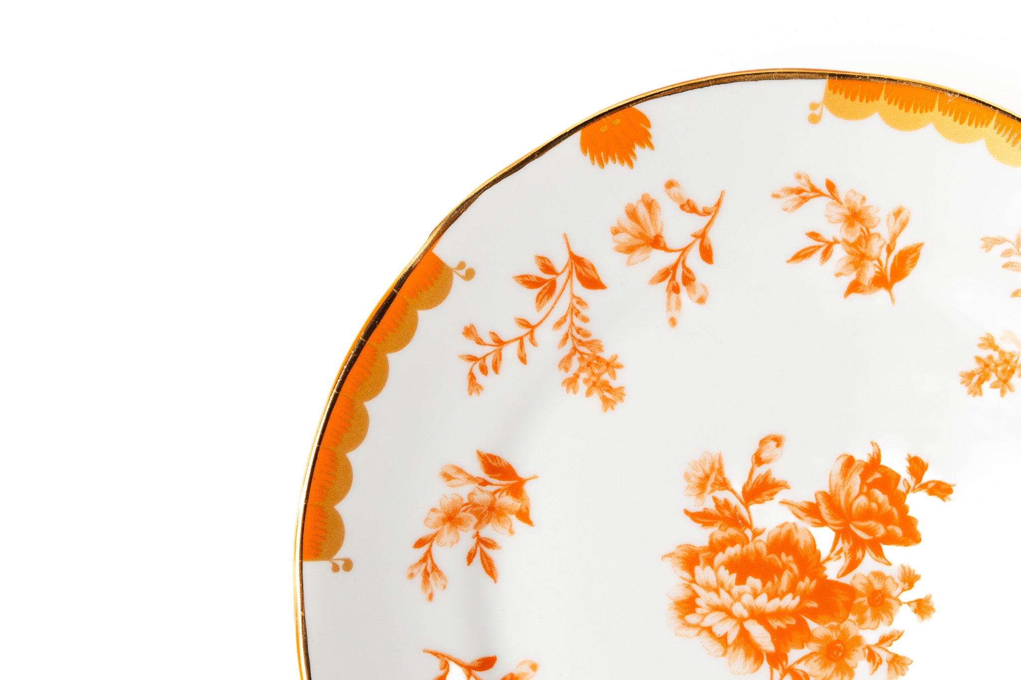 A Coleção Laranjeira Imperial celebra o encanto dos jardins mediterrâneos, onde flores exuberantes desabrocham sob a luz do sol. A combinação dos tons alaranjados vibrantes com o acabamento em ouro transmite uma sofisticação atemporal, aliada a um calor natural que acolhe.