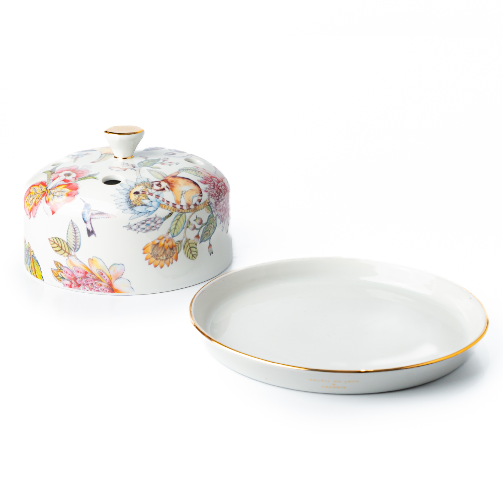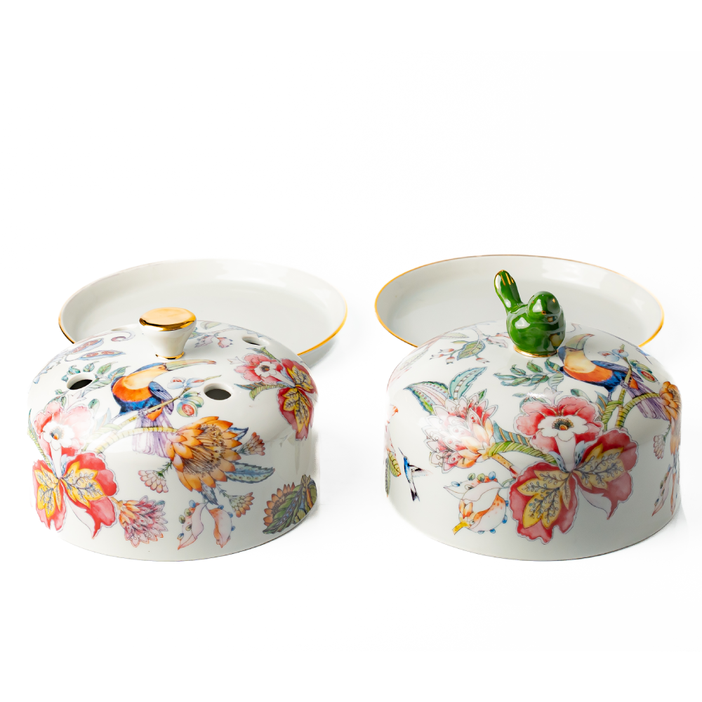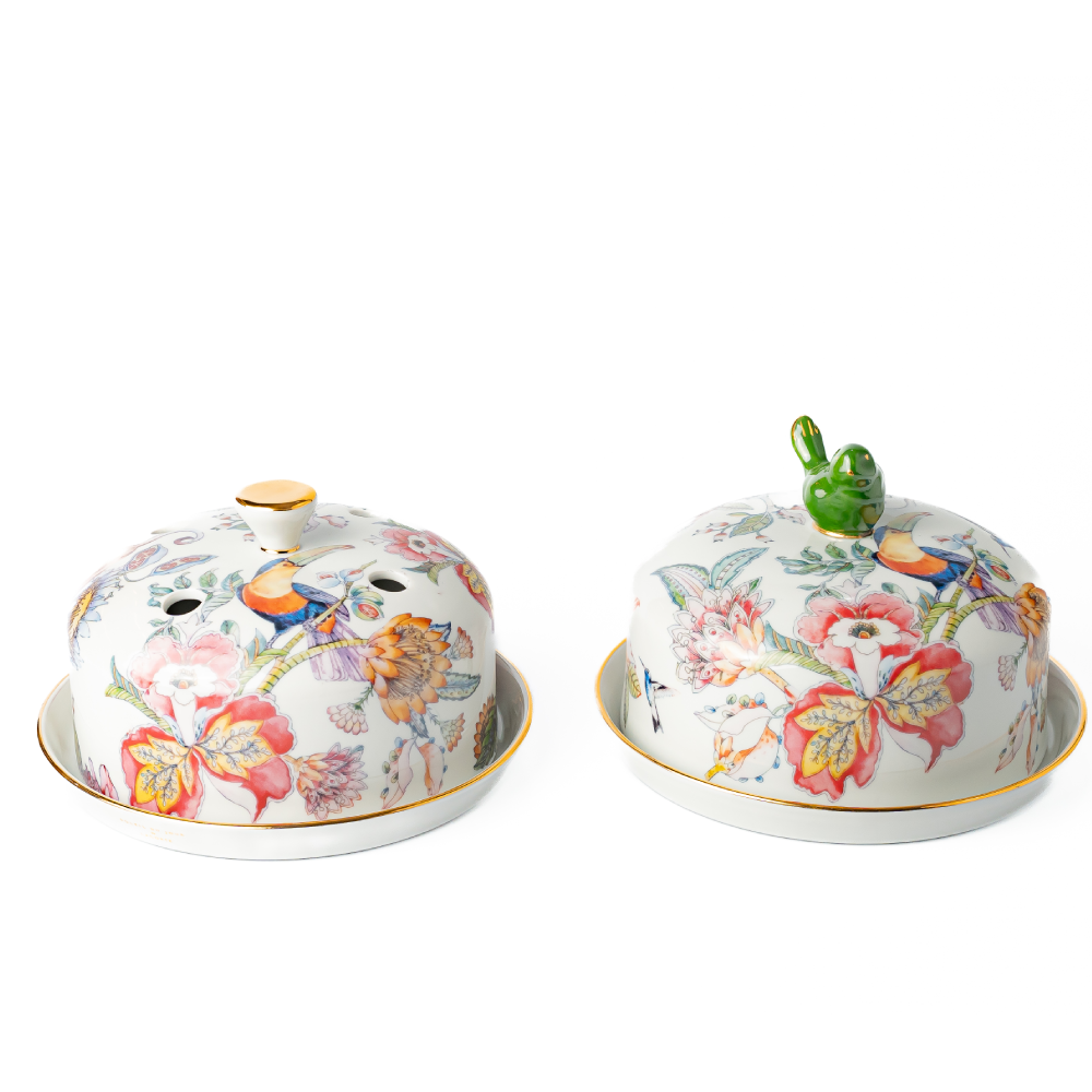 A Coleção Botanic é um tributo à exuberância das florestas tropicais e à delicadeza da fauna que nelas habita. A Queijeira Botanic traduz essa conexão com a natureza através de uma porcelana impecável, onde o frescor das ilustrações botânicas encontra a elegância de detalhes lúdicos e sofisticados.
