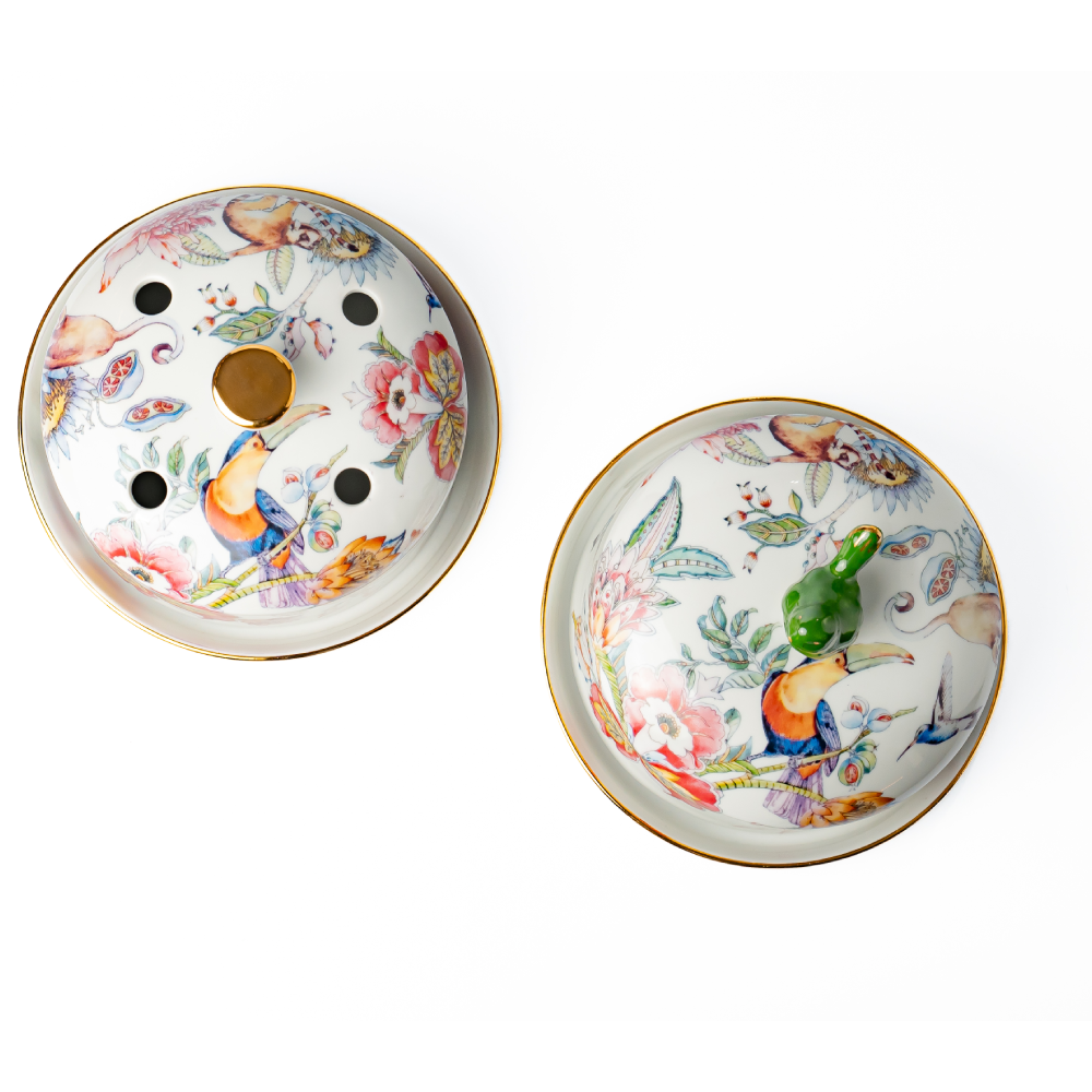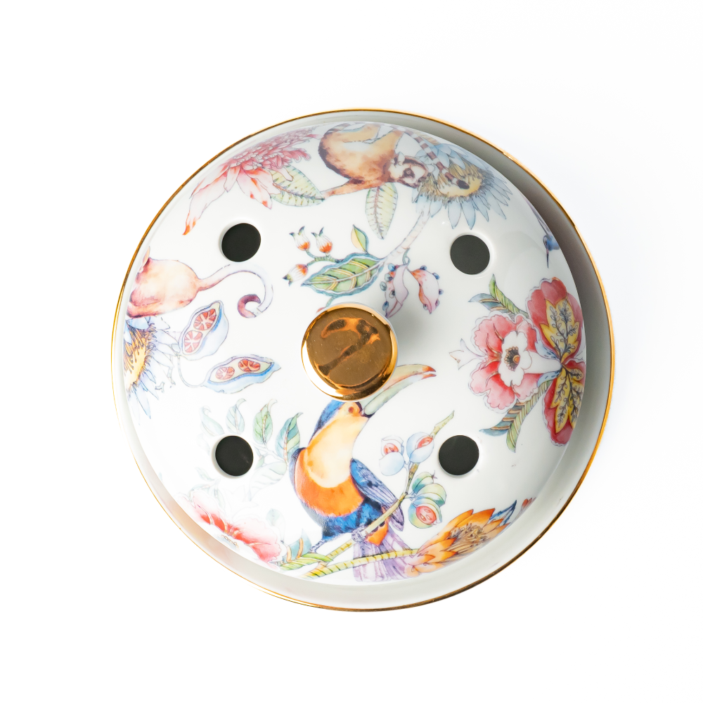 Cada peça é adornada com desenhos minuciosos de flores vibrantes e animais silvestres, como o mico-leão e pássaros, que parecem ganhar vida sobre a superfície branca. O pegador, esculpido em formato de pássaro em um verde profundo, não é apenas um detalhe funcional, mas uma assinatura de estilo que confere um toque escultural e único à peça.