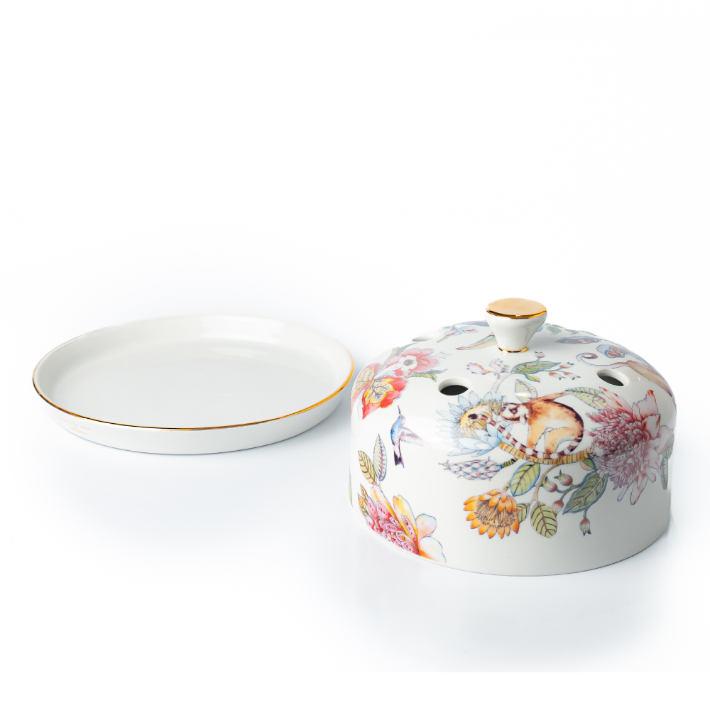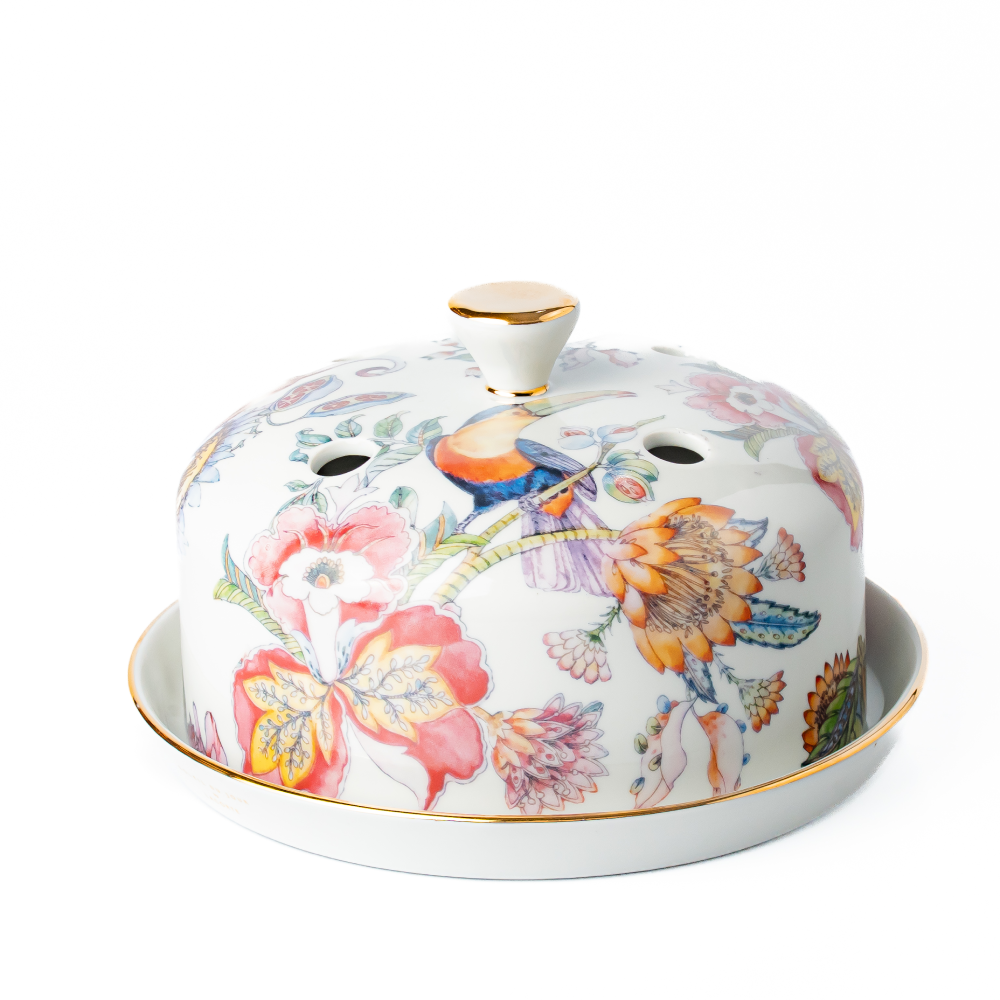 Com um acabamento refinado e bordas sutilmente douradas, a queijeira equilibra perfeitamente a vivacidade das cores com uma nobreza clássica. Ela foi desenhada para se destacar em mesas de café da manhã ou brunchs sofisticados, integrando-se harmoniosamente tanto a ambientes rústicos quanto aos mais modernos.