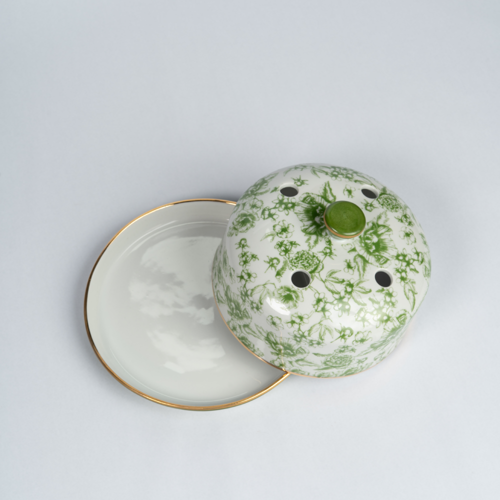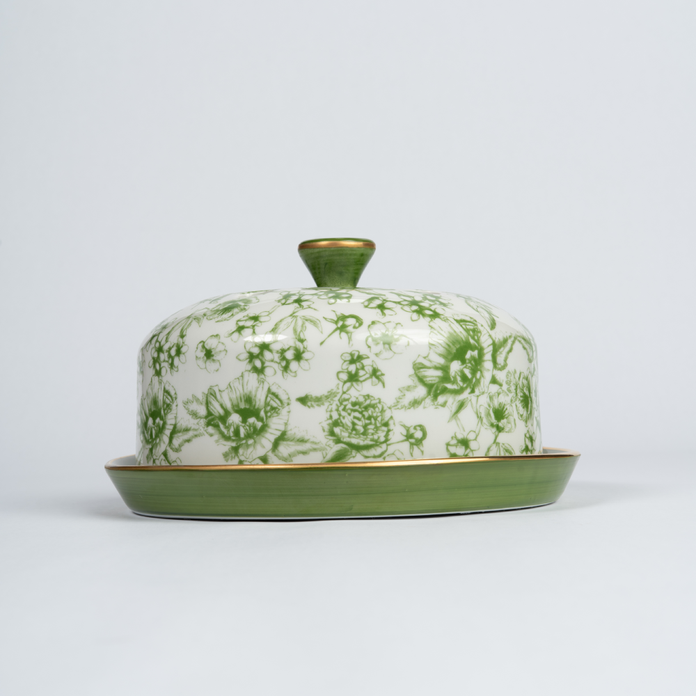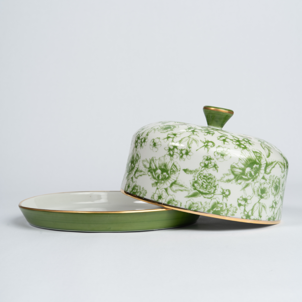 Cada detalhe foi projetado para elevar o ato de servir. O prato e a cúpula apresentam ilustrações ricas e minuciosas, retratando a flora aquática e elementos que remetem à herança histórica dessa região icônica. O acabamento impecável, aliado ao design funcional do furo para respiro, garante que a peça não seja apenas um objeto decorativo, mas um item indispensável para a conservação ideal do alimento.
