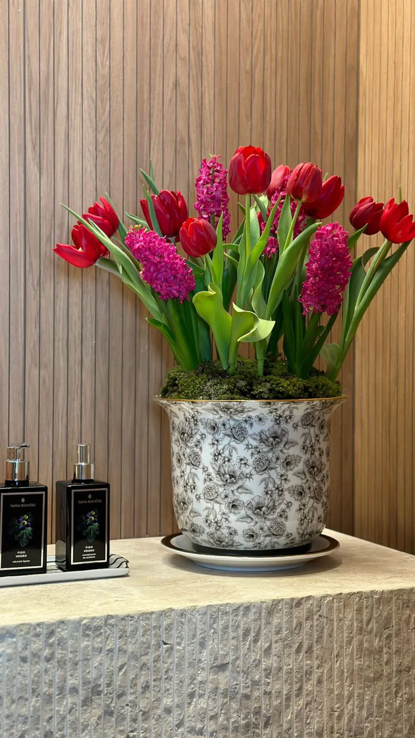 Vaso Cachepot Grande Porcelana Especial Estampa Exclusiva + Prato de base Papoula